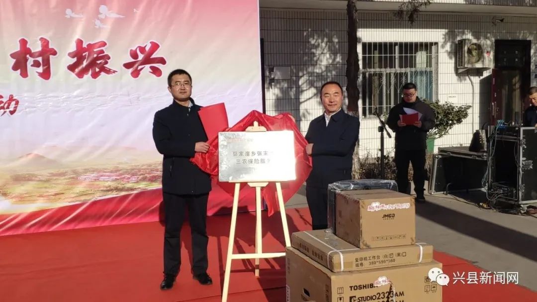 活动中,县农业农村局、平安产险山西分公司主要负责人一同为党建共建点揭牌,蔡家崖乡、平安产险吕梁中支相关负责人为三农服务点揭牌。平安产险还为张家岔村基层党建阵地捐赠了价值3万余元的电脑、打印机等办公设备。