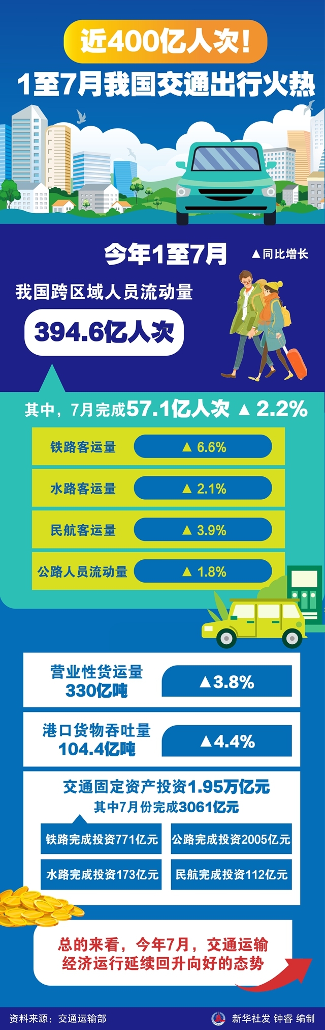 今年1至7月,我国跨区域人员流动量达394.6亿人次,同比增长3.9%。