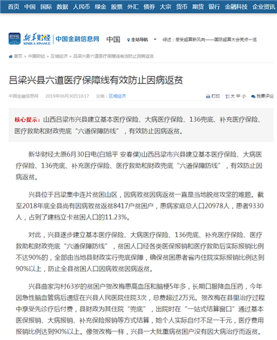 山西吕梁市兴县建立基本医疗保险、大病医疗保险、136兜底、补充医疗保险、医疗救助和财政兜底“六道保障防线”,有效防止因病返贫。