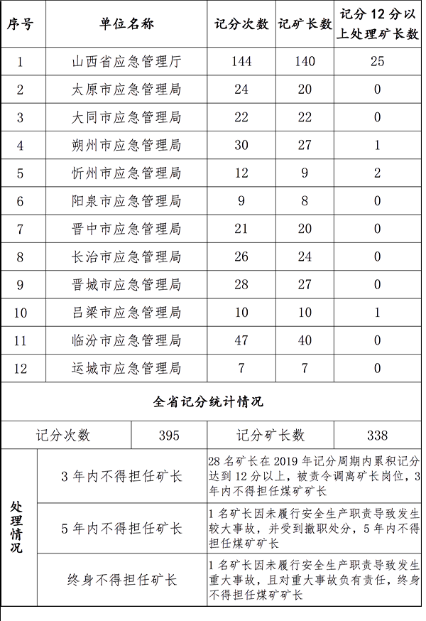 7-12月全省煤矿矿长安全生产考核记分工作情况表