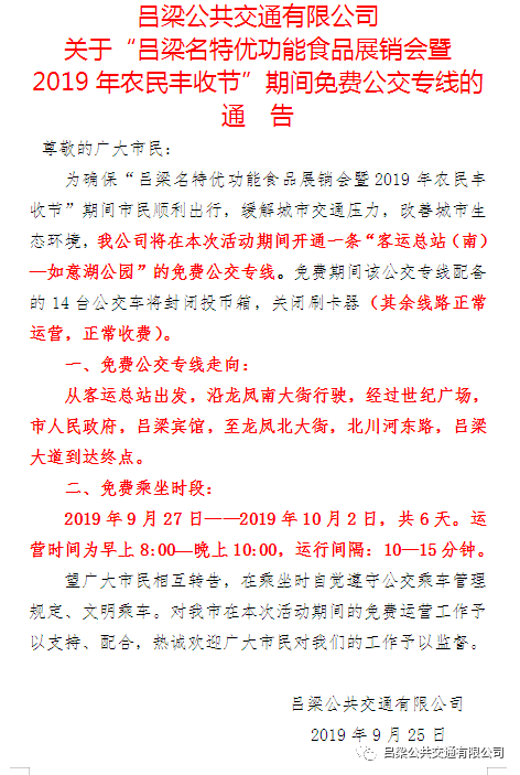 关于“吕梁名特优功能食品展销会暨2019年农民丰收节”期间免费公交专线的通告