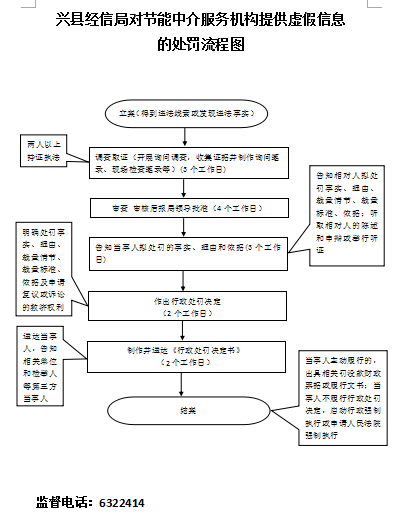 | 行政处罚 | 74352541-4-CF-0002 | 对节能中介服务机构提供虚假信息的处罚 | 【法律】《中华人民共和国节约能源法》第七十六条。 | 1、立案责任:根据日常管理中发现或者接到举报、控告的纳税人违法行为案件,予以审查,决定是否立案; 2、调查责任:指定专人负责,对违法行为线索调查取证,有直接利害关系的应当回避;执法人员不得少于两人,调查时应出示执法证件,允许当事人辩解陈述; 3、审查责任:对违法事实、证据、调查取证程序、法律适用、处罚种类和幅度、当事人陈述和申辩理由等进行审查,提出处理意见; 4、告知责任:做出行政处罚决定前,应书面告知当事人违法事实及其享有的陈述、申辩、要求听证等权利; 5、决定责任:制作行政处罚决定书,载明行政处罚告知、当事人陈述申辩或者听证情况等内容; 6、送达责任:将行政处罚决定书送达当事人; 7、执行责任:在处罚决定规定的期限内停止项目建设或生产并进行改造。当事人在法定期限内不申请行政复议或者提起行政诉讼,又不履行处罚决定的,报请同级人民政府责令关闭; 8、其他法律法规规章文件规定应履行的责任。 |