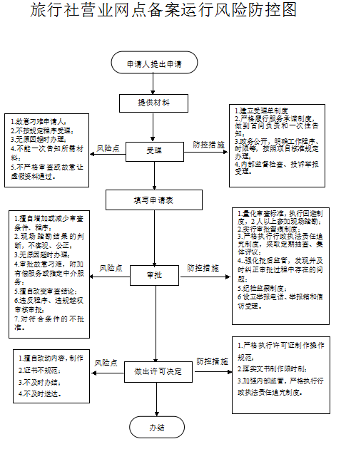 行政其他 | 78582431-6-QT-0002 | 旅行社营业网点备案 | 【法规】《旅行社条例》(国务院令第550号)第十一条 【规章】《旅行社条例实施细则》(2009年国家旅游局令第30号)第二十一条、第二十二条、第二十三条、第二十四条、第二十五条 | 1、受理责任:公示应当提交的材料,一次性告知补正材料,依法受理或不予受理(不予受理应当告知理由)。 2、审查责任:对书面申请材料进行审查、提出是否同意的审核意见,根据需要组织现场踏勘、检查,采取论证会、听证会或者其他方式征求利害关系人、专家、公众的意见,涉及公共利益的重大许可向社会公示。 3、决定责任:做出行政许可或者不予行政许可决定,法定告知(不予许可的应当当面告知理由) 4、送达责任:准予许可的制发、送达许可证,许可决定作出后,向社会公布。 5、事后监管责任:建立实施监督检查的运行机制和管理制度,开展定期和不定期检查,依法采取相关处置措施。 6、其他法律法规规章文件规定应履行的责任。 | 因不履行或不正确履行行政职责,有下列情形的,行政机关及相关工作人员应承担相应责任: 1.对符合法定条件的行政许可申请不予受理; 2.不在办公场所公示依法应当公示的材料; 3.未向申请人、利害关系人履行法定告知义务; 4.申请人提交的申请材料不齐全、不符合法定形式,不一次告知申请人必须补正的全部内容; 5.未依法说明不受理行政许可申请或者不予行政许可的理由; 6.依法应当举行听证而不举行听证; 7.对不符合法定条件的申请人准予行政许可或者超越法定职权作出准予行政许可决定的; 8.对符合法定条件的申请人不予行政许可或者不在法定期限内作出准予行政许可决定的; 9.不依法履行监督职责或者监督不力,造成严重后果。 | 受理责任:1.《行政许可法》第三十二条;2.《旅行社条例》(国务院令第550号)第十一条 审查责任:1.《行政许可法》第三十四条; 2《旅行社条例实施细则》(2009年国家旅游局令第30号) 第二十一条、第二十二、第二十三条、; 决定责任:1.《行政许可法》第三十八条;2.《行政许可法》第三十九条;3.《行政许可法》第四十条;4.《《旅行社条例实施细则》(2009年国家旅游局令第30号) 第二十四条 送达责任:《行政许可法》第四十四条 事后监管责任:《行政许可法》第六十一条 | 1.《行政许可法》第七十二条:由其上级行政机关或者监察机关责令改正;情节严重的,对直接负责的主管人员和其他直接责任人员依法给予行政处分。 2.《行政许可法》第七十三条:行政机关工作人员办理行政许可、实施监督检查,索取或者收受他人财物或者谋取其他利益,构成犯罪的,依法追究刑事责任;尚不构成犯罪的,依法给予行政处分。 3.《行政许可法》第七十四条:由其上级行政机关或者监察机关责令改正,对直接负责的主管人员和其他直接责任人员依法给予行政处分;构成犯罪的,依法追究刑事责任。 4.《行政许可法》第七十七条:由其上级行政机关或者监察机关责令改正,对直接负责的主管人员和其他直接责任人员依法给予行政处分;构成犯罪的,依法追究刑事责任。 5.《中华人民共和国旅游法》第一百零九条:旅游主管部门和有关部门的工作人员在履行监督管理职责中,滥用职权、玩忽职守、徇私舞弊,尚不构成犯罪的,依法给予处分。 6.《旅行社条例》第六十六条:对直接负责的主管人员和其他直接责任人员依法给予处分 | ||