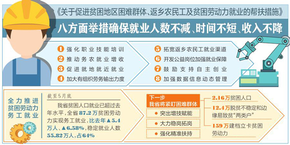 外出务工是贫困劳动力就业的重要渠道。新冠肺炎疫情严重冲击贫困劳动力外出务工。为了克服疫情影响,我省采取积极措施,全力推进贫困劳动力务工就业。省扶贫办相关负责人介绍,截至5月底,我省贫困人口就业已超过去年水平,全省87.2万贫困劳动力实现务工就业,比去年增加5.4万人、增长6.58%,稳定就业人数55.82万人,占64%。