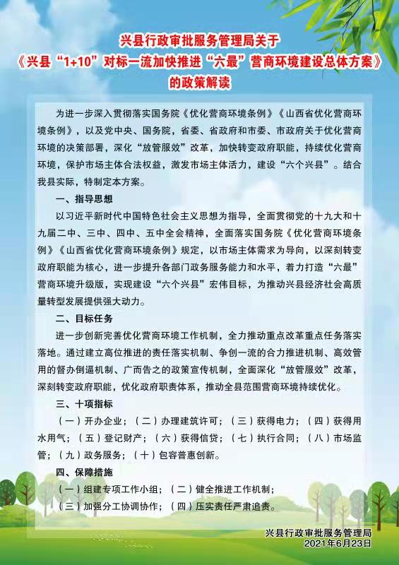 文件链接:兴县人民政府办公室关于印发兴县“1+10”对标一流加快推进“六最”营商环境建设总体方案的通知