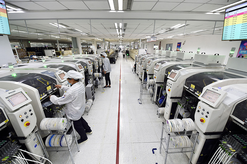 工人在位于安徽合肥的联宝(合肥)电子科技有限公司生产车间内忙碌(2020年3月5日摄)。新华社记者 周牧 摄