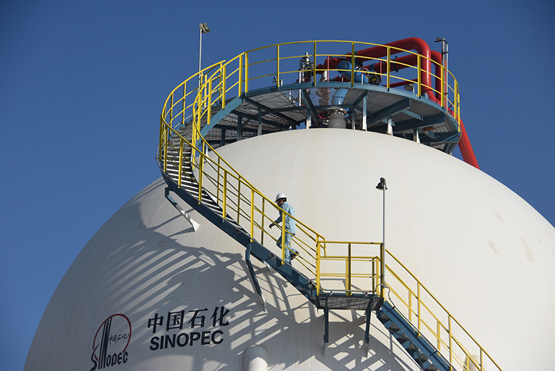 中国石化新疆库车绿氢示范项目的员工对储氢罐进行巡检(2023年6月30日摄)。新华社记者 顾煜 摄