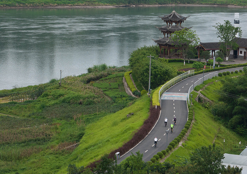 骑行爱好者骑行在长江环线绿道四川宜宾市南溪区长江村段上(2023年6月29日摄,无人机照片)。新华社记者 江宏景 摄