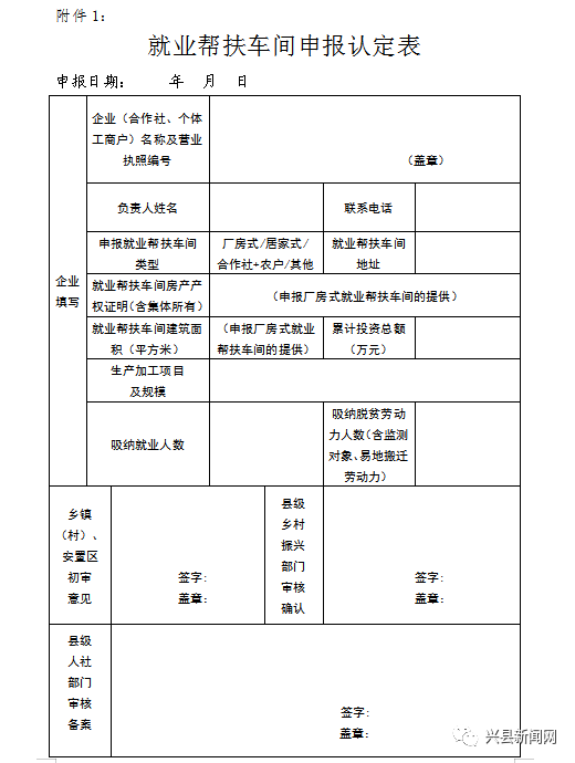 附件: 1.就业帮扶车间申报认定表
