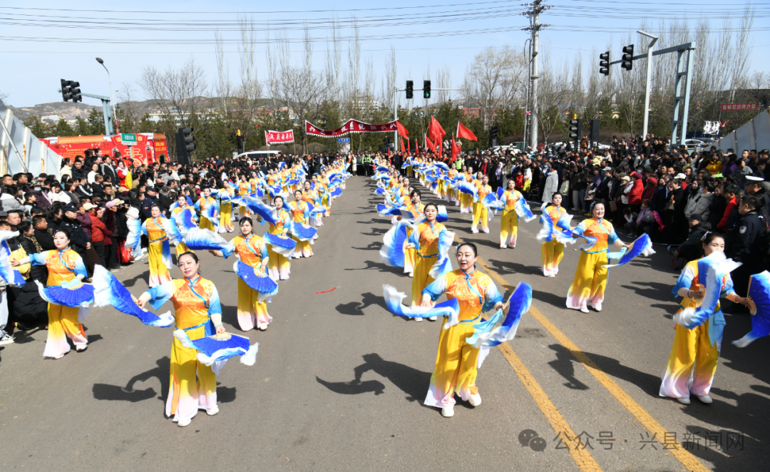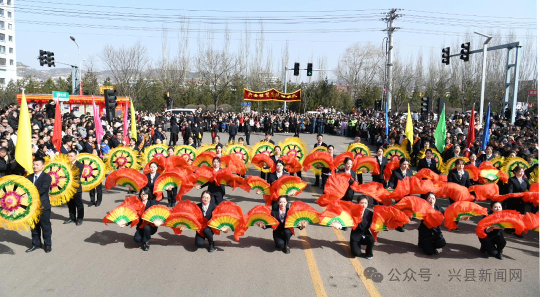 上午9时,展演队伍自阳光上城集结出发,一路沿蔚汾北路、石盘头大桥、西关大桥、明珠广场、石堂会大桥等城区主干道迤逦行进。铿锵有力的锣鼓敲出激昂奋进的节奏,高亢嘹亮的唢呐奏响幸福美满的乐章。展演现场,彩扇如云翻飞,红绸似火飘舞,处处流光溢彩,欢声雷动,将节日的兴县装点成一片欢乐的海洋。